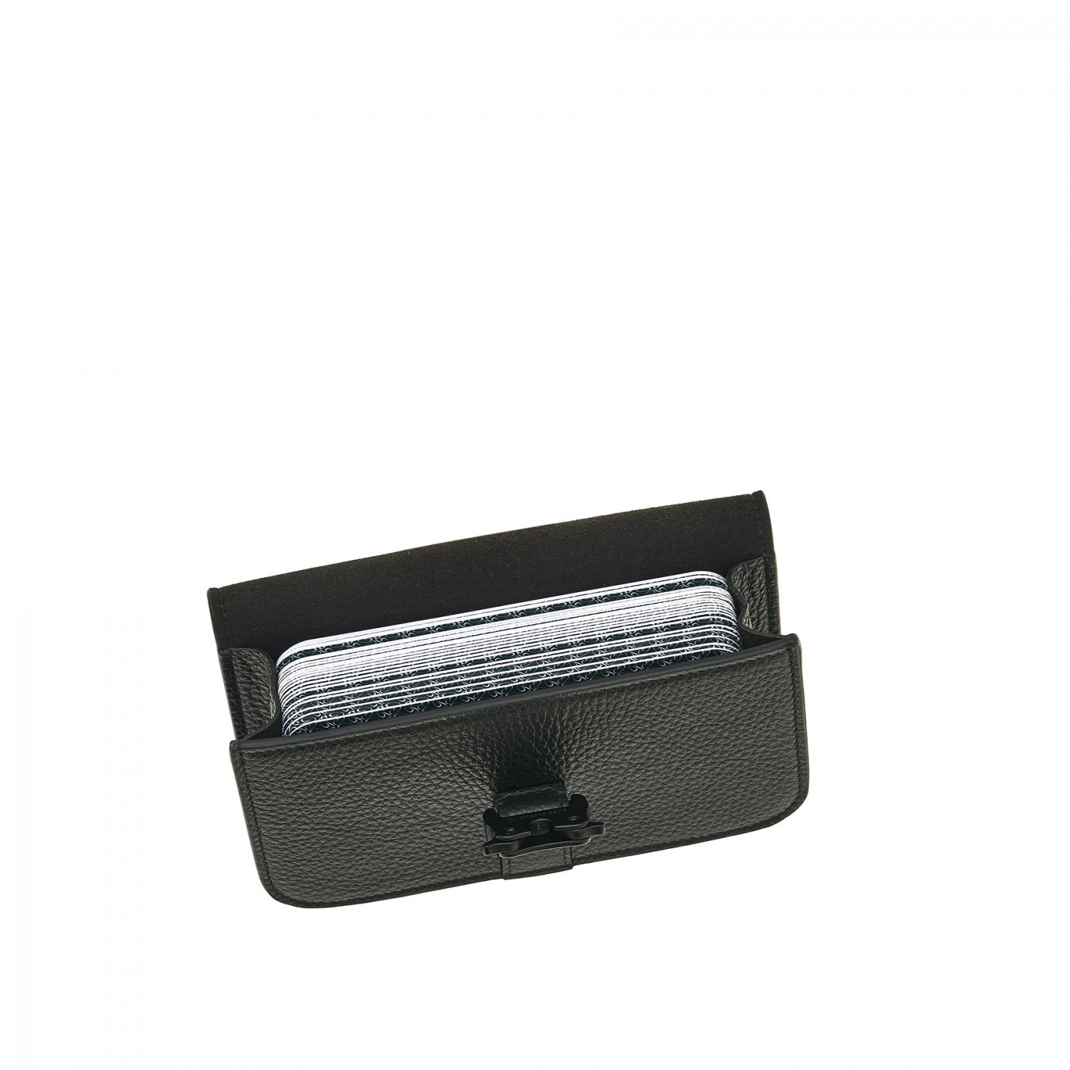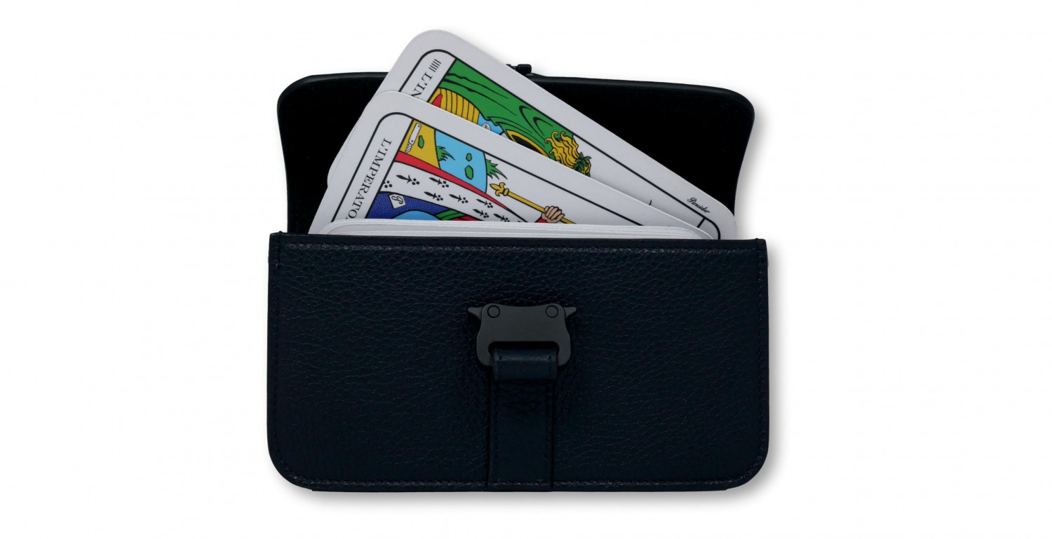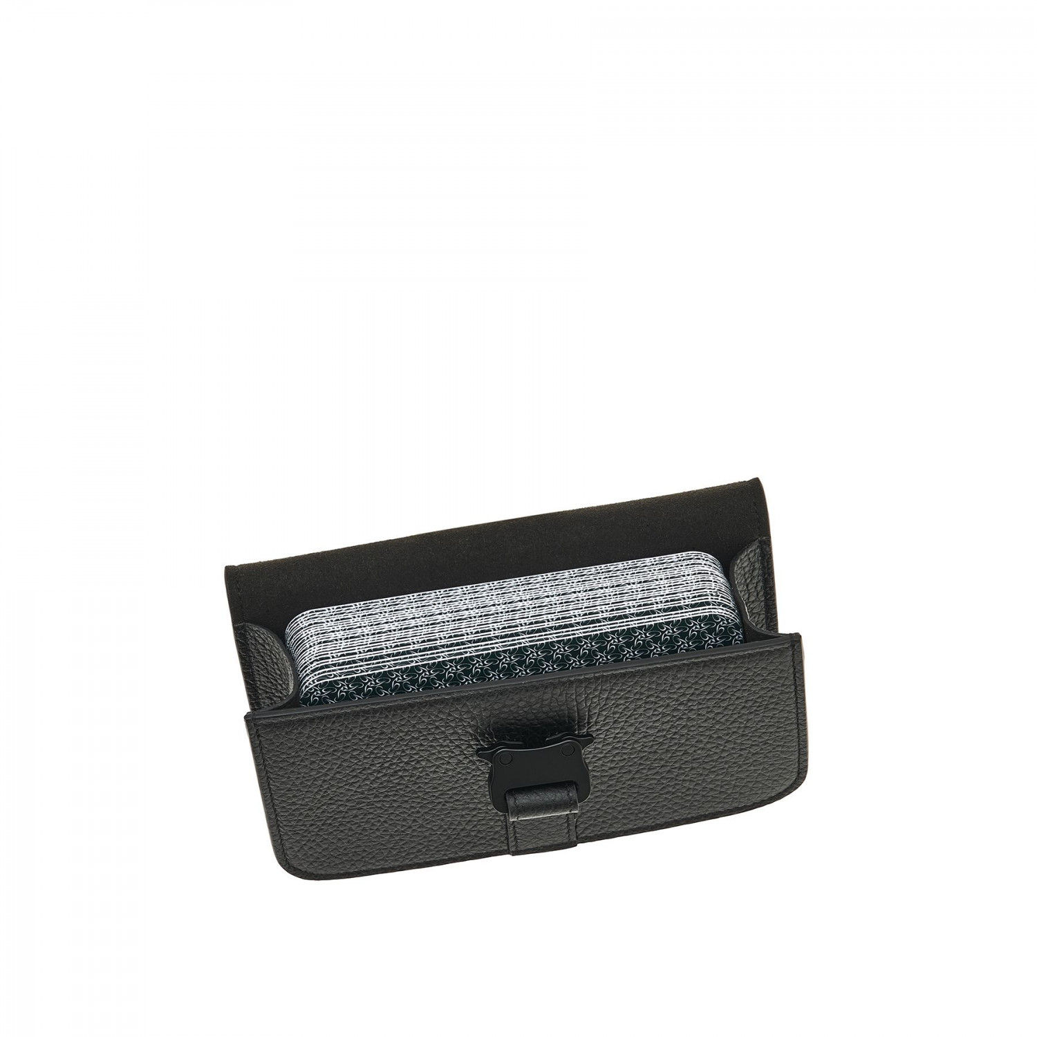 Elegante porta carte da tarocchi con custodia realizzata in pelle saffiano. le carte al suo interno rappresentano il mondo dellartigianalità pineider.