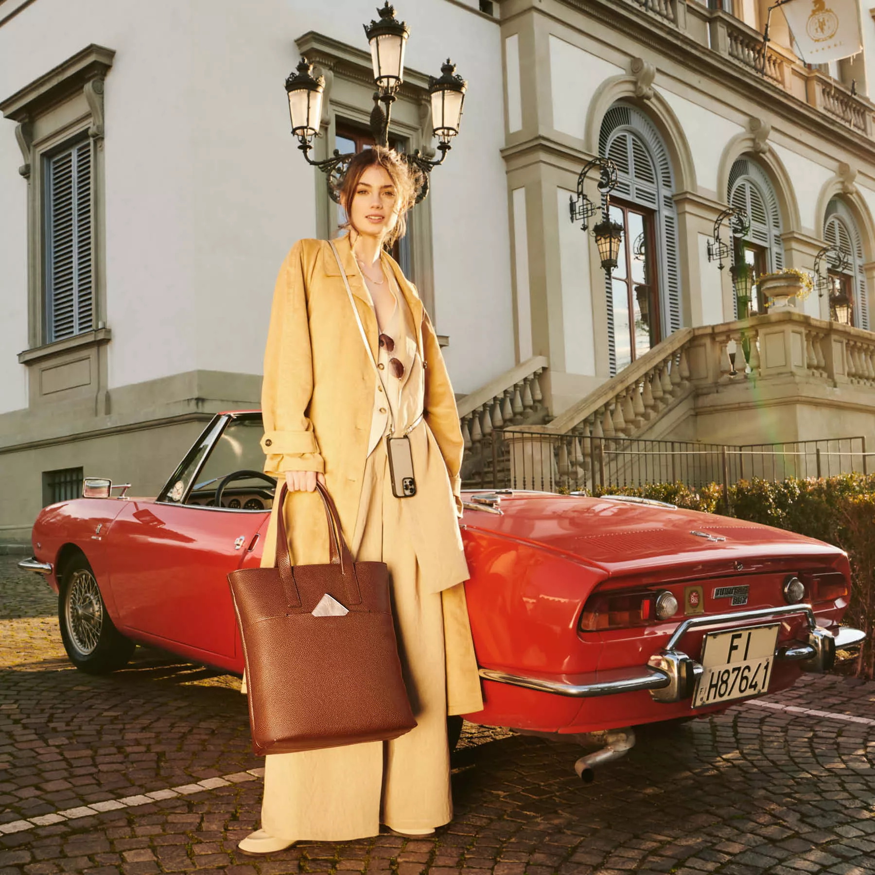 Shopper allungata in verticale, in vera pelle bottalata, Grained Collection. Logo Pineider. Made in Italy.