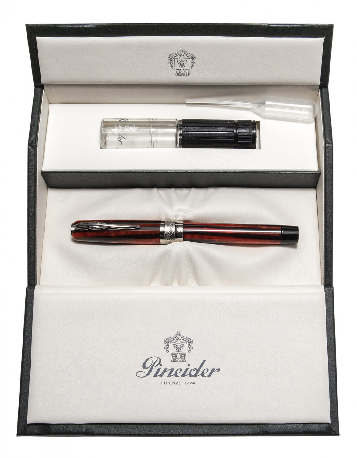 Arco Firefox penna stilografica fa parte di una collezione limitata in cui la particolarità della penna risiede nel materiale: una sovrapposizione di strati trasparenti e opachi che viene prima tagliata a misura e poi tornita con un'inclinazione di 4 gradi. Il risultato è un materiale semitrasparente e cangiante. Dotata di riempimento a pistone, chiusura magnetica e di un pennino in oro 14kt è stata prodotta in 888 pezzi numerati. Completa la penna il suo luxury box con pregiata carta Pineider. La formulazione dei nostri inchiostri è appositamente studiata per evitare l'essiccazione. Made in Italy.
