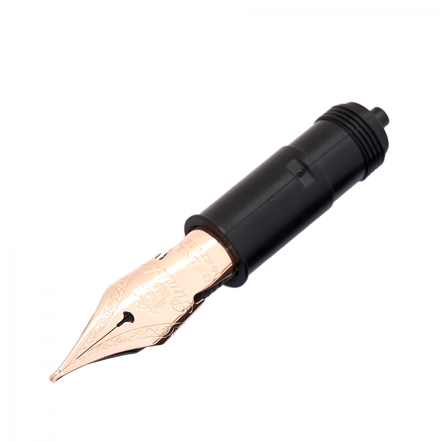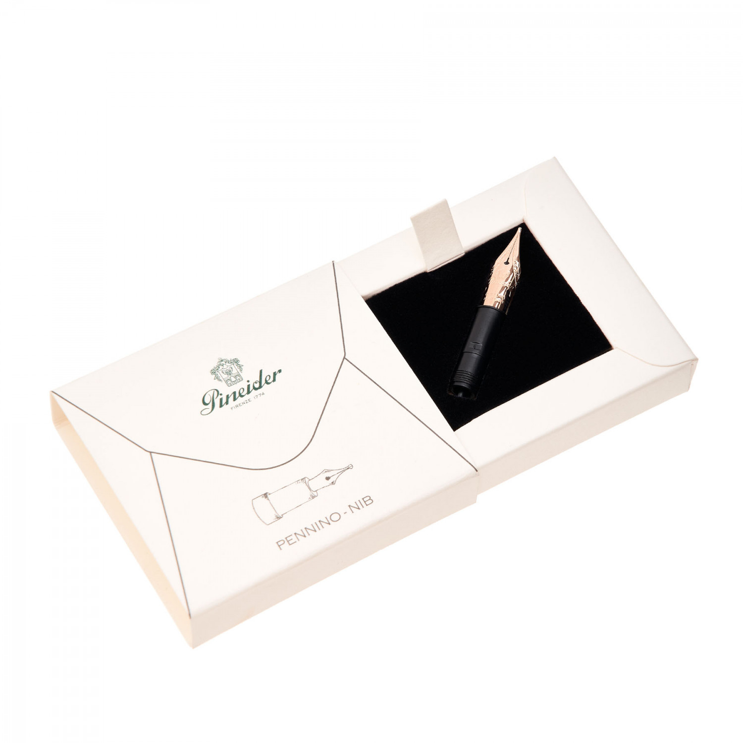 Realizzato in oro 14 KT è flessibile e dinamico.L'incisione della punta è ispirata a una stampa art nouveau, tratta dall'archivio Pineider. Secondo il design di ogni penna, il pennino deve la sua lucentezza alloro giallo, oppure riceve una finitura in oro rodiato o rosa.