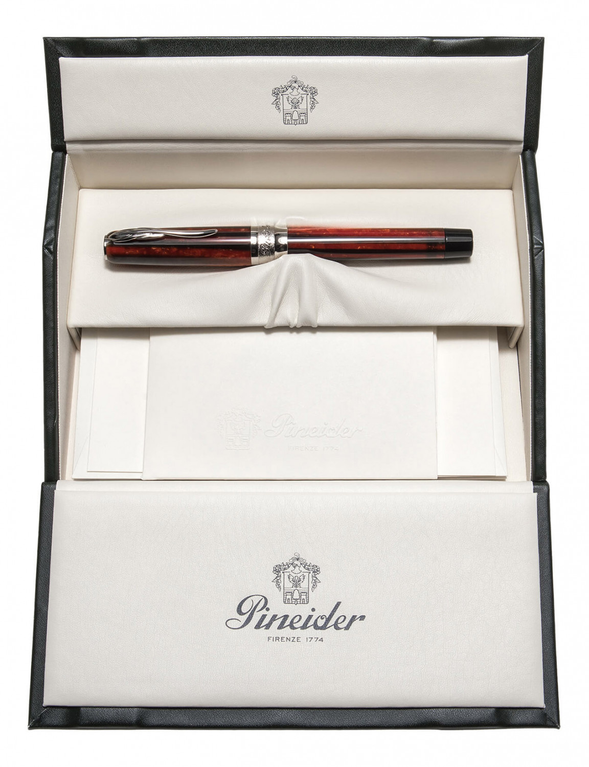 Arco Firefox penna roller fa parte di una collezione limitata in cui la particolarità della penna risiede nel materiale: una sovrapposizione di strati trasparenti e opachi che viene prima tagliata a misura e poi tornita con un'inclinazione di 4 gradi. Il risultato è un materiale semitrasparente e cangiante. Dotata di chiusura magnetica e di un pennino in oro 14kt è stata prodotta in 888 pezzi numerati. Completa la penna il suo luxury box con pregiata carta Pineider. La formulazione dei nostri inchiostri è appositamente studiata per evitare l'essiccazione. Made in Italy.