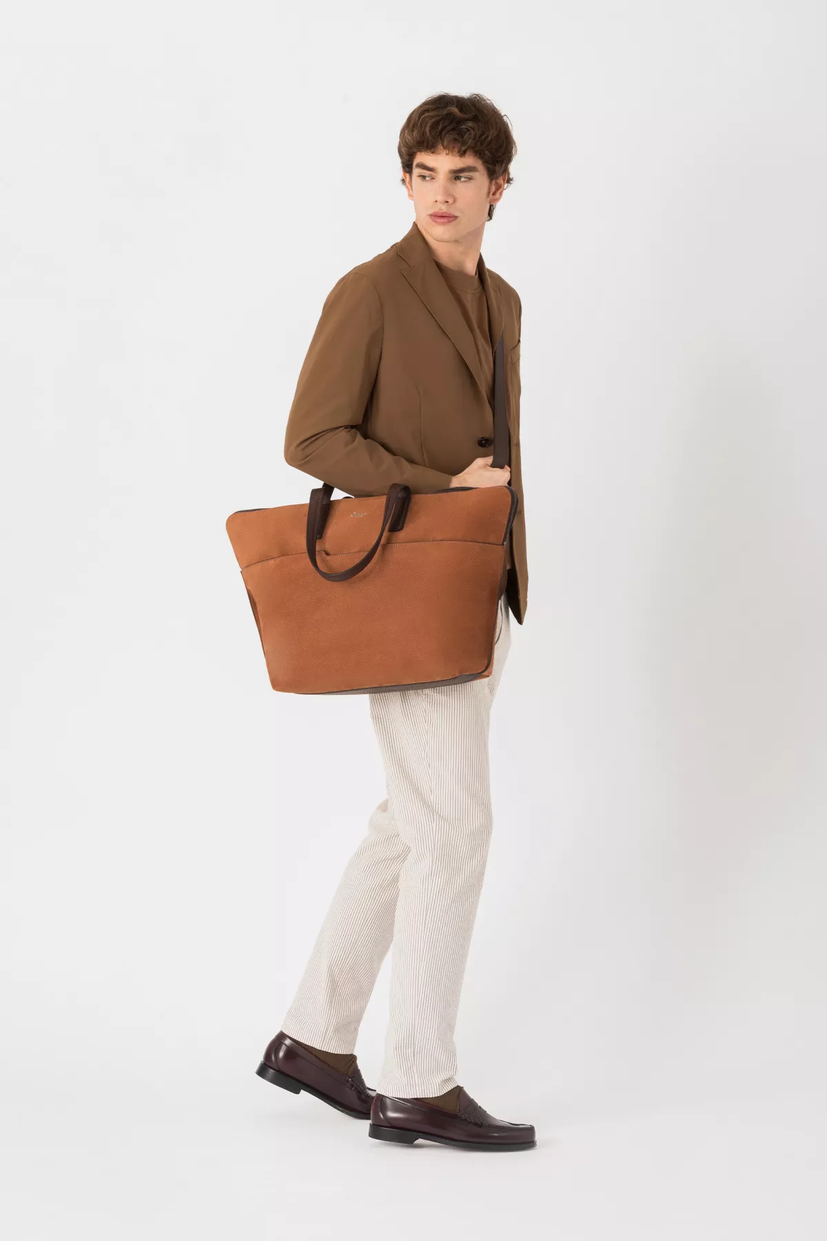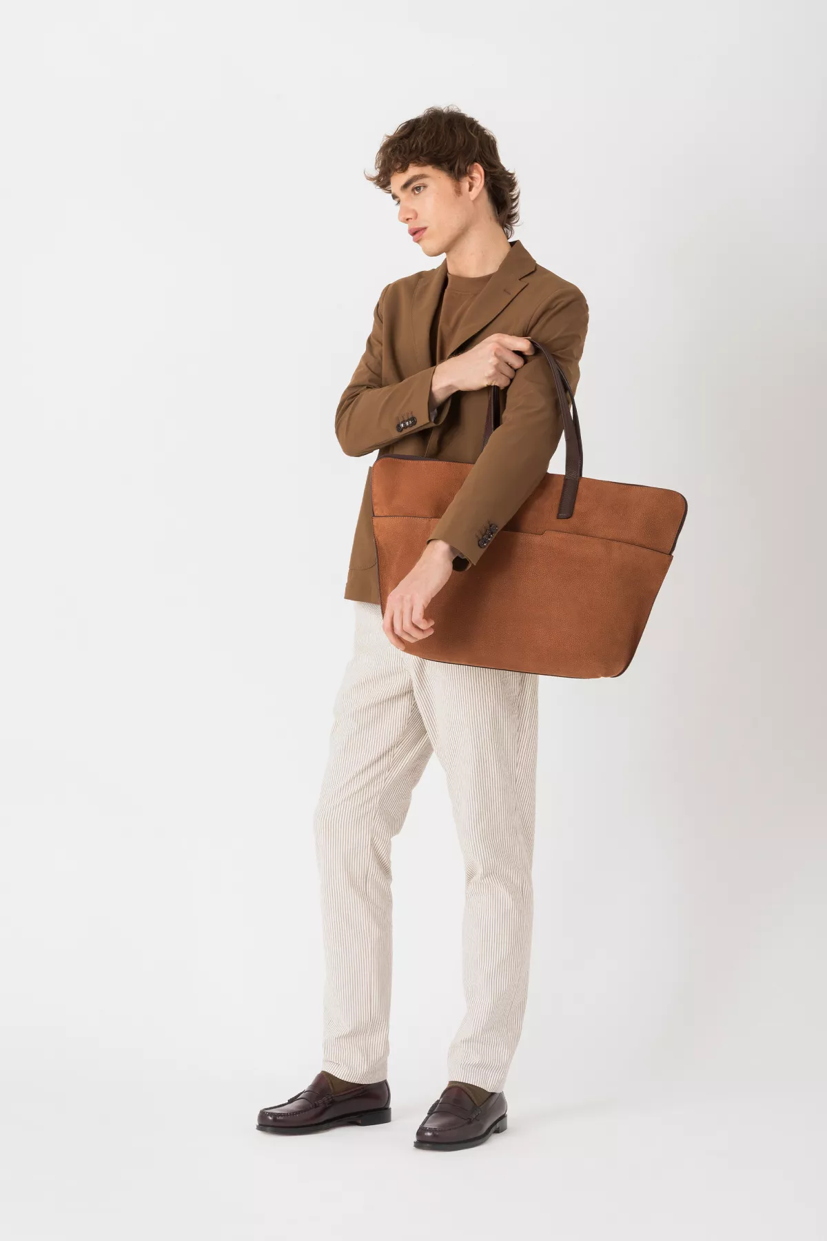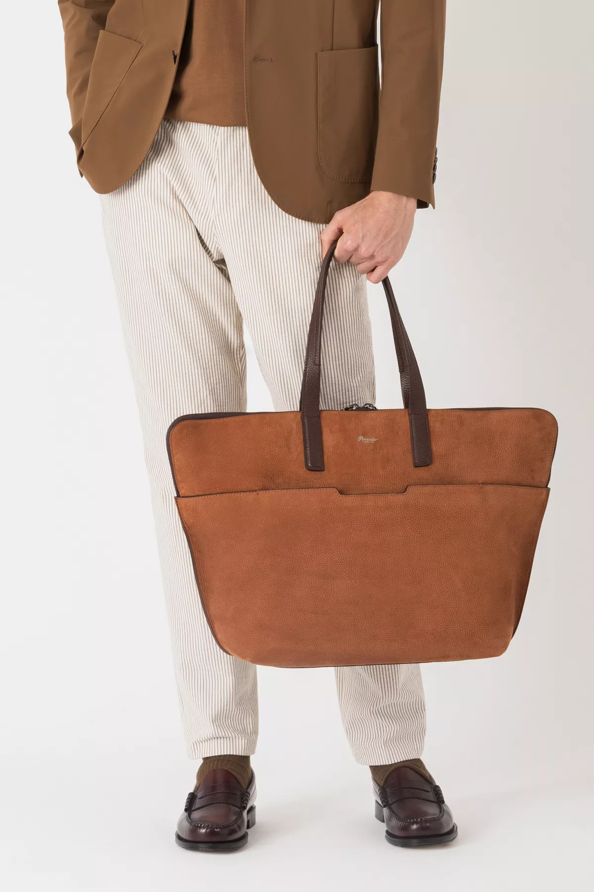 Realizzata in pregiata pelle nubuck, questa borsa tote combina eleganza e funzionalità con una silhouette distintiva e cuciture dettagliate. Il meccanismo di chiusura a doppia fibbia scorrevole garantisce un'ampia apertura, mentre l'interno organizzato offre una spaziosa tasca con zip e altre tasche per gli accessori quotidiani. Dotata di manici robusti per un trasporto confortevole, il logo Pineider impresso a caldo sigilla il prestigio del Made in Italy.