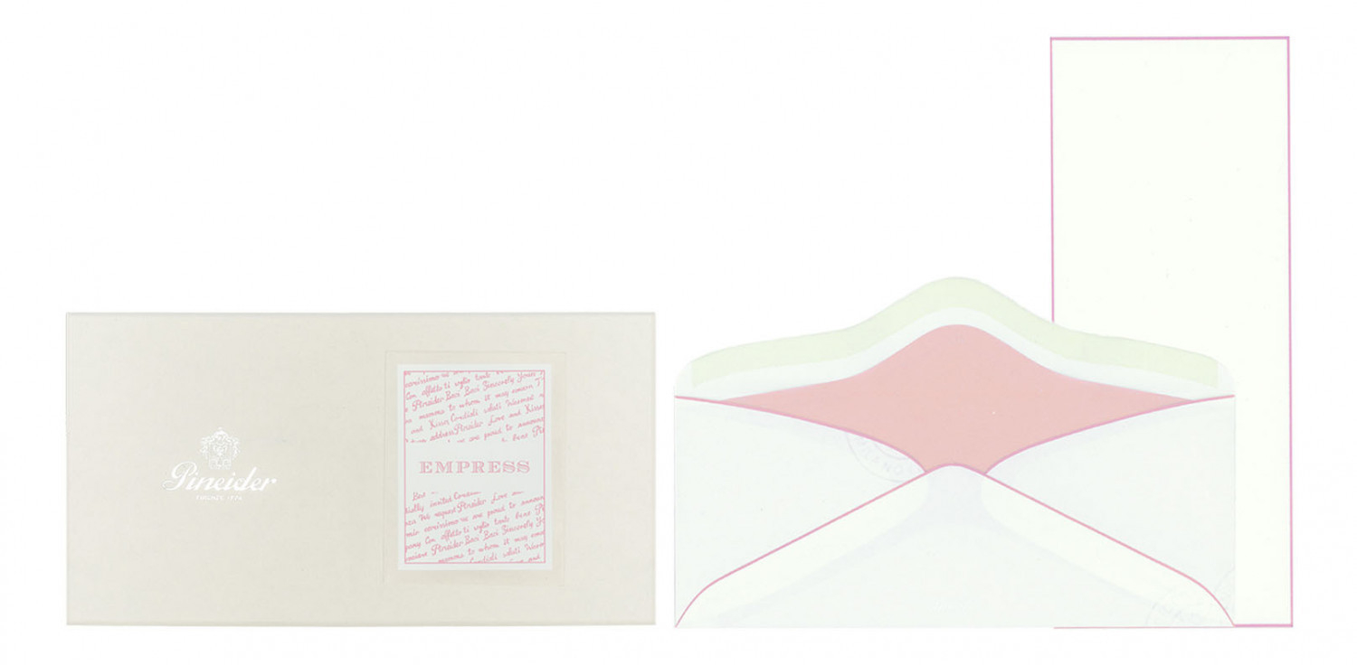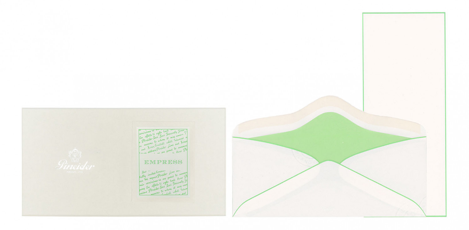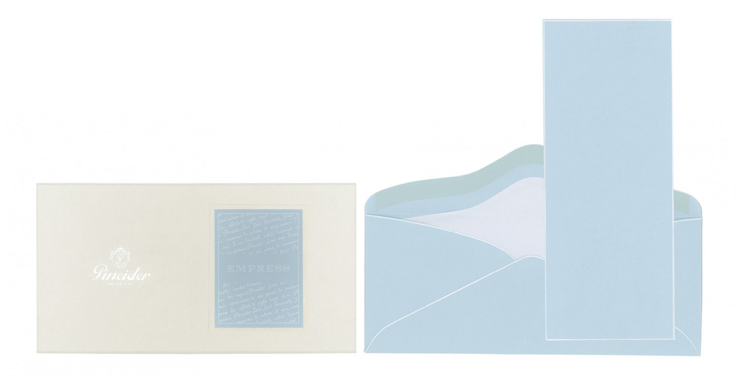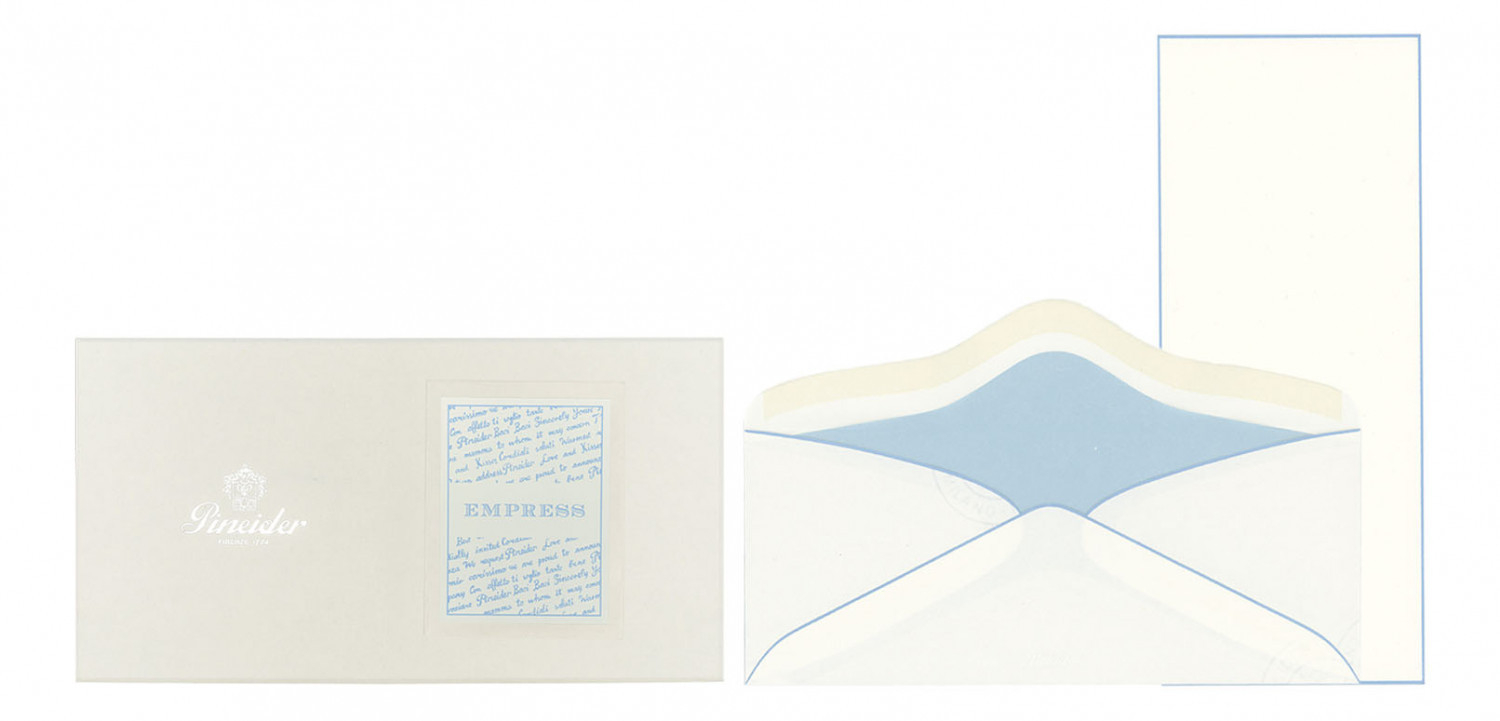 Confezione Empress 12 cart. + 12 buste - Form. Long. Cartoncini lisci, 300 gr. filigranati Pineider, taglio netto, bordati a mano. Buste 110 gr. foderate con carta velina dello stesso colore del bordo e personalizzate con logo Pineider a rilievo a secco.