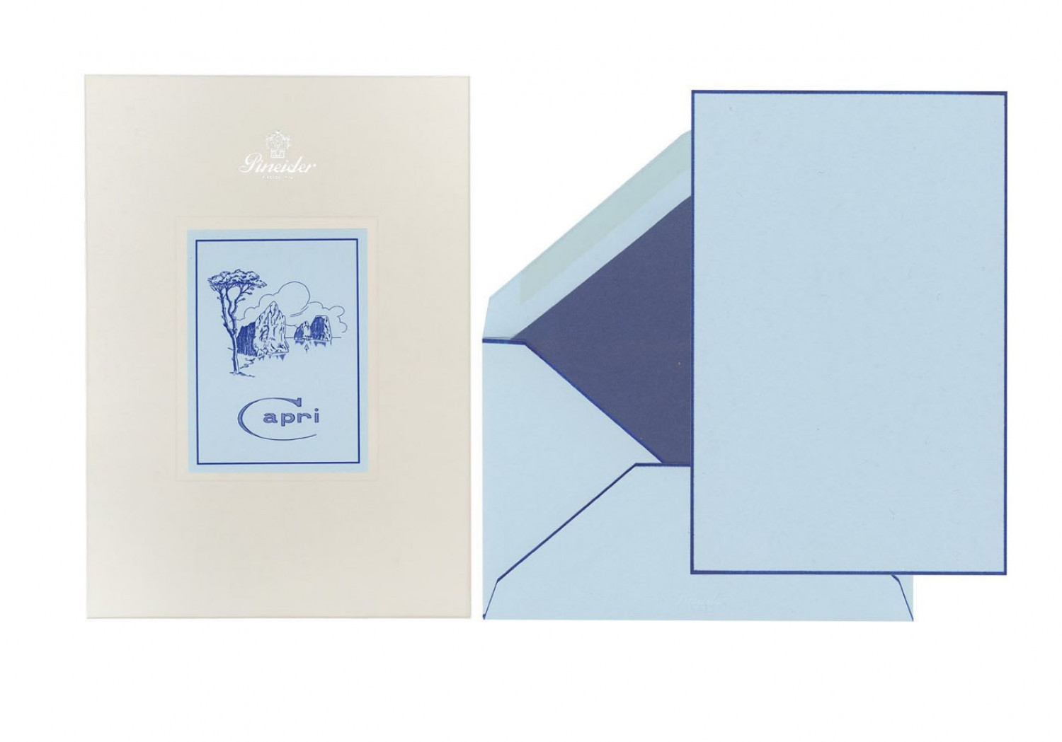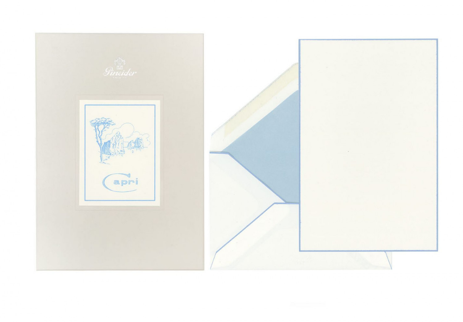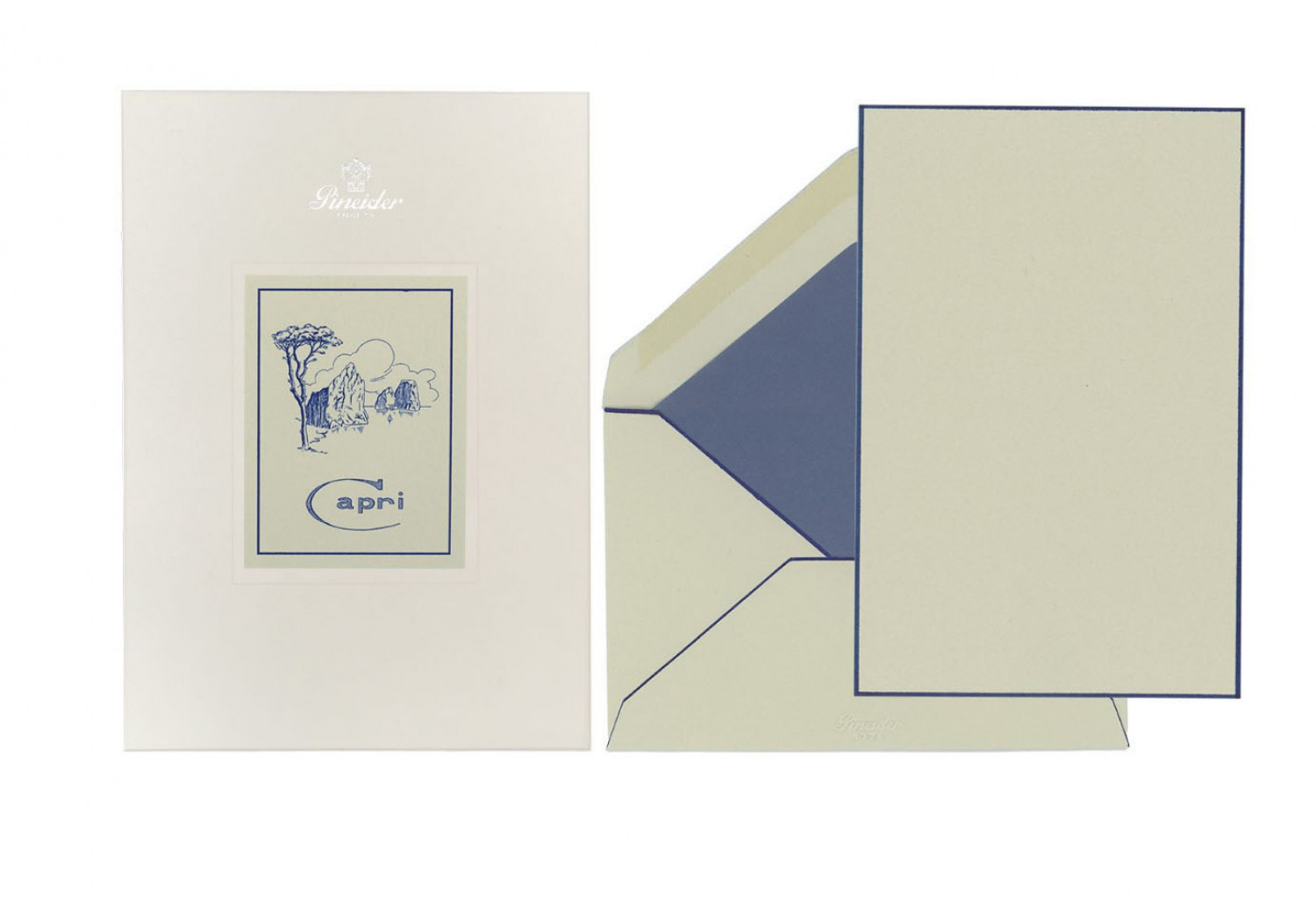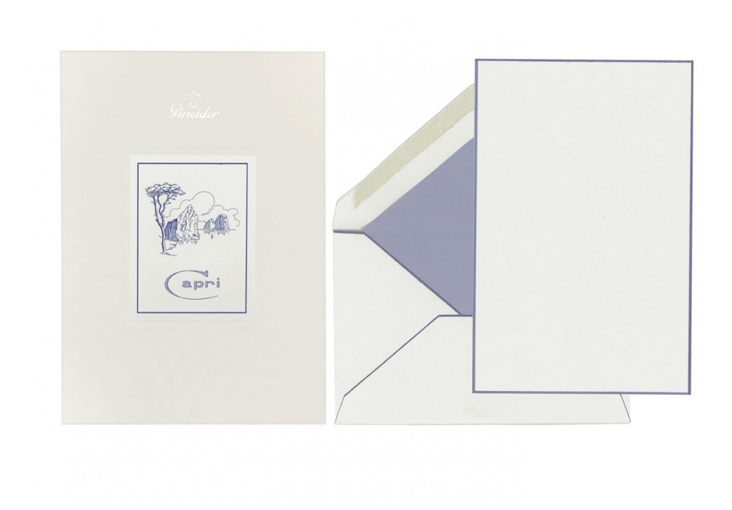 Set Capri 24 fogli + 24 buste - Form. A4. Carta liscia, 110 gr. sfrangiata e filigranata Pineider. Cartoncini lisci, sfrangiati. Buste 110 gr. foderate con carta velina bianca e personalizzate Pineider a secco.