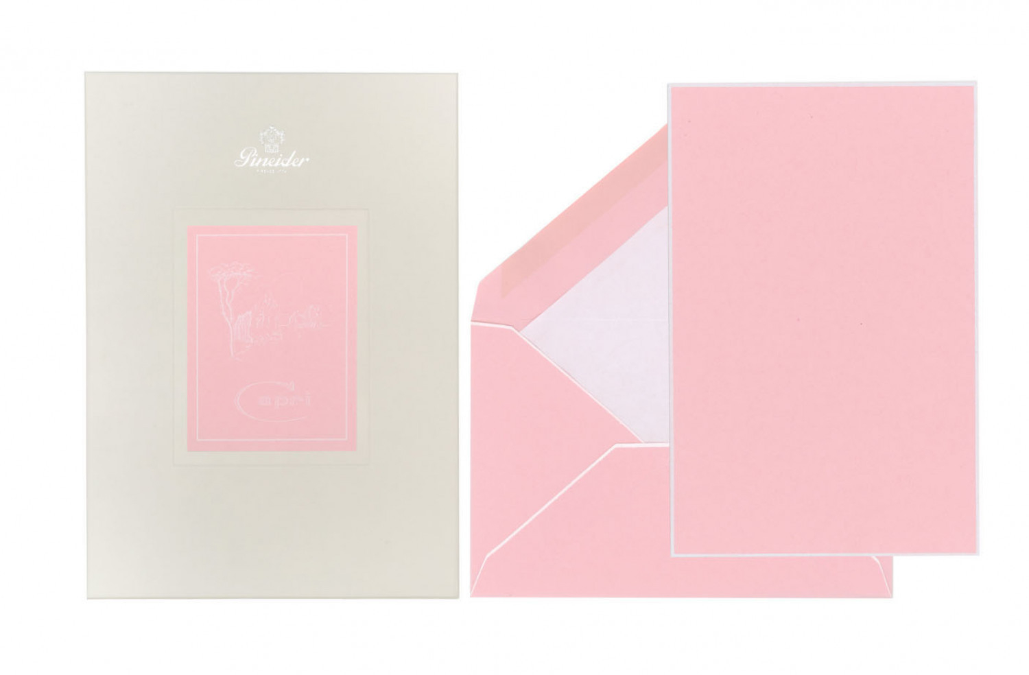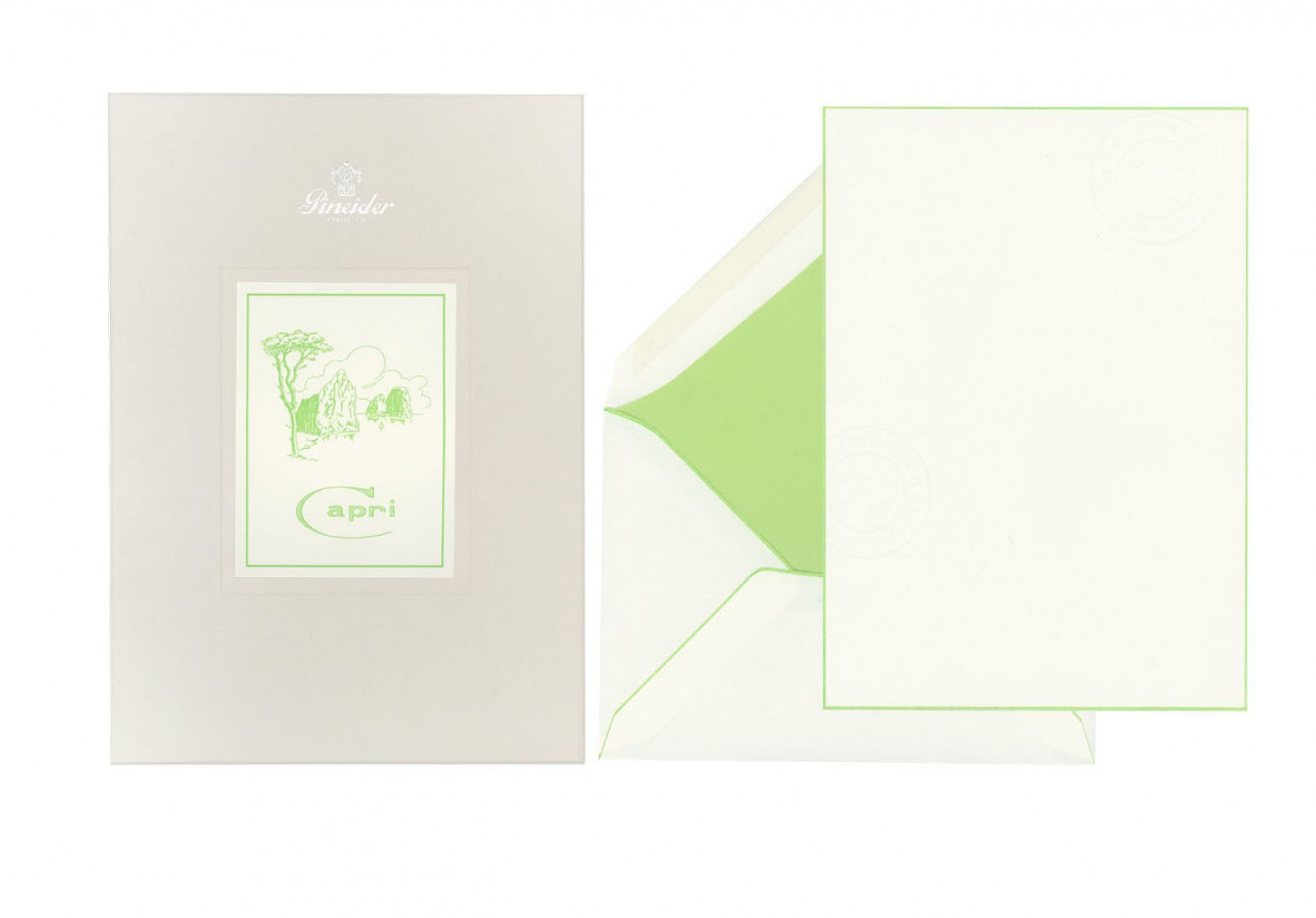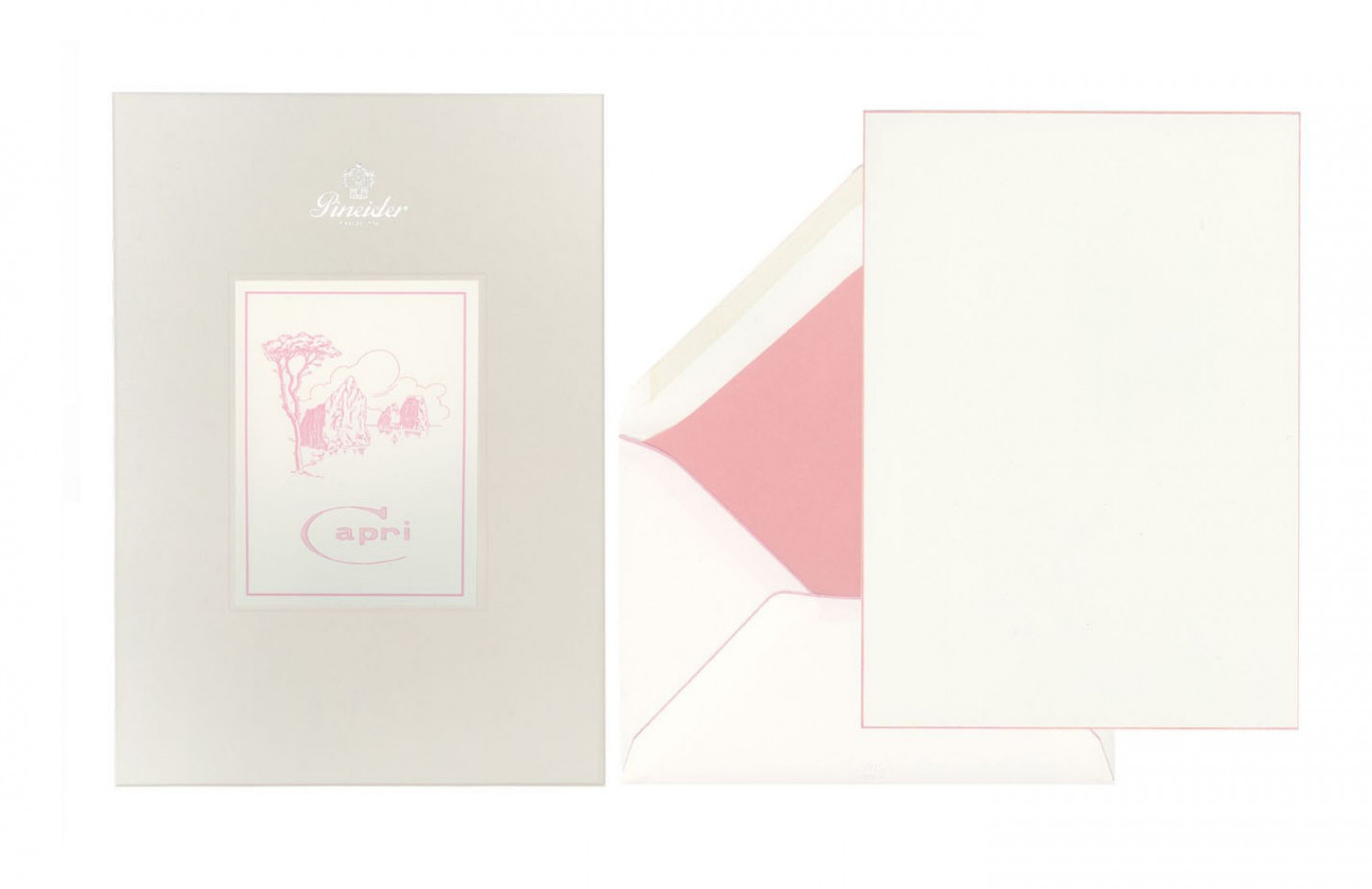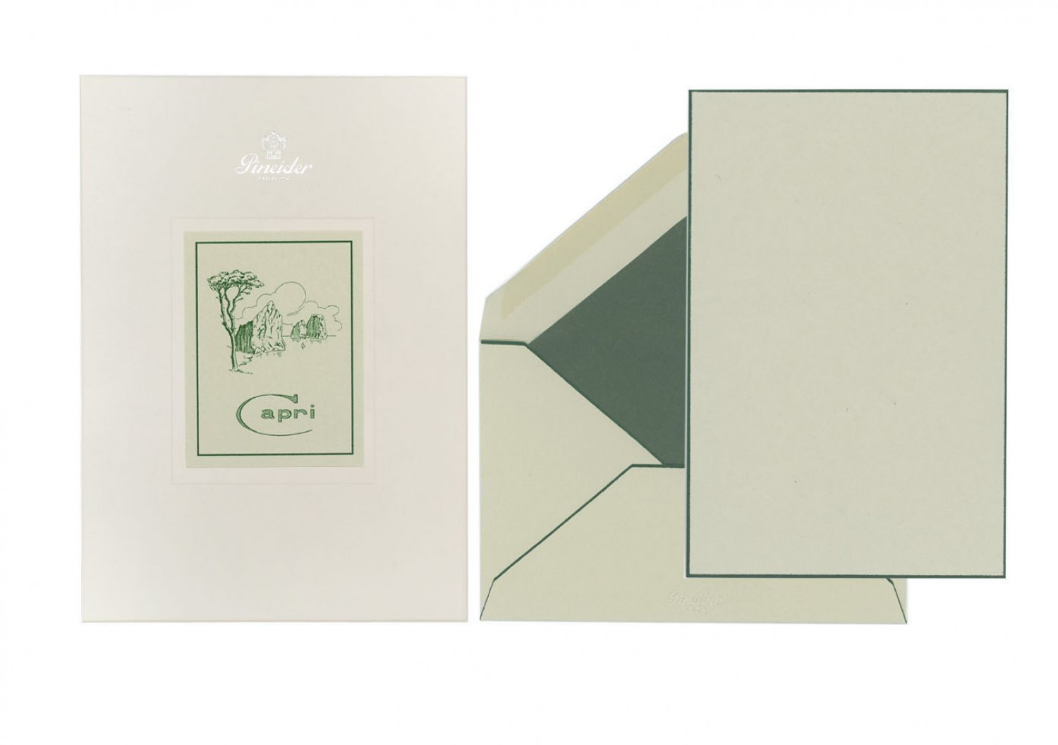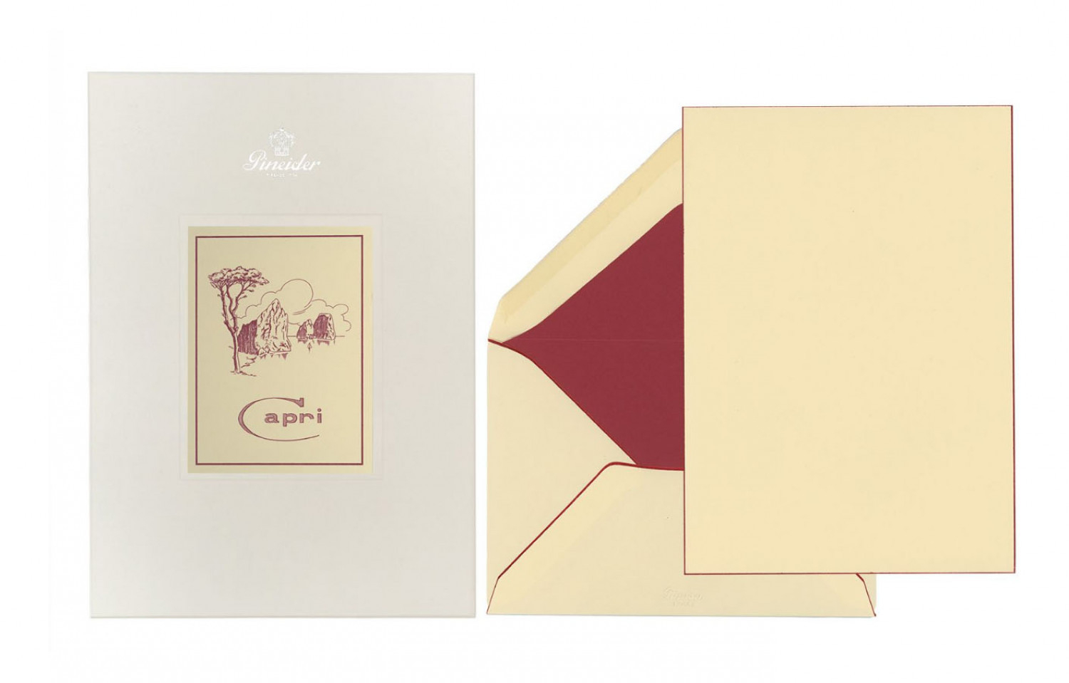 Set Capri 24 fogli + 24 buste - Form. A4. Carta liscia, 110 gr. sfrangiata e filigranata Pineider. Cartoncini lisci, sfrangiati. Buste 110 gr. foderate con carta velina bianca e personalizzate Pineider a secco.