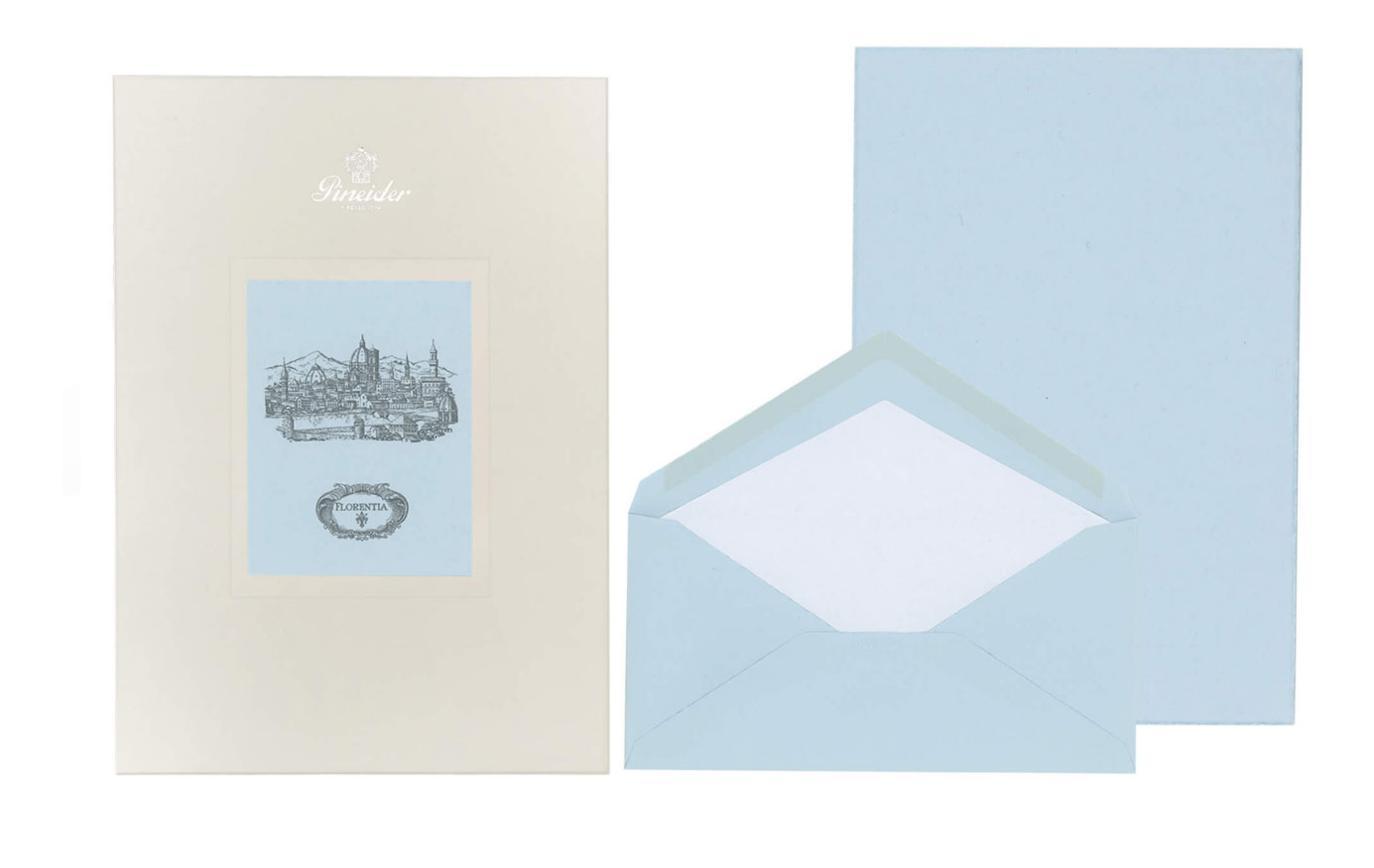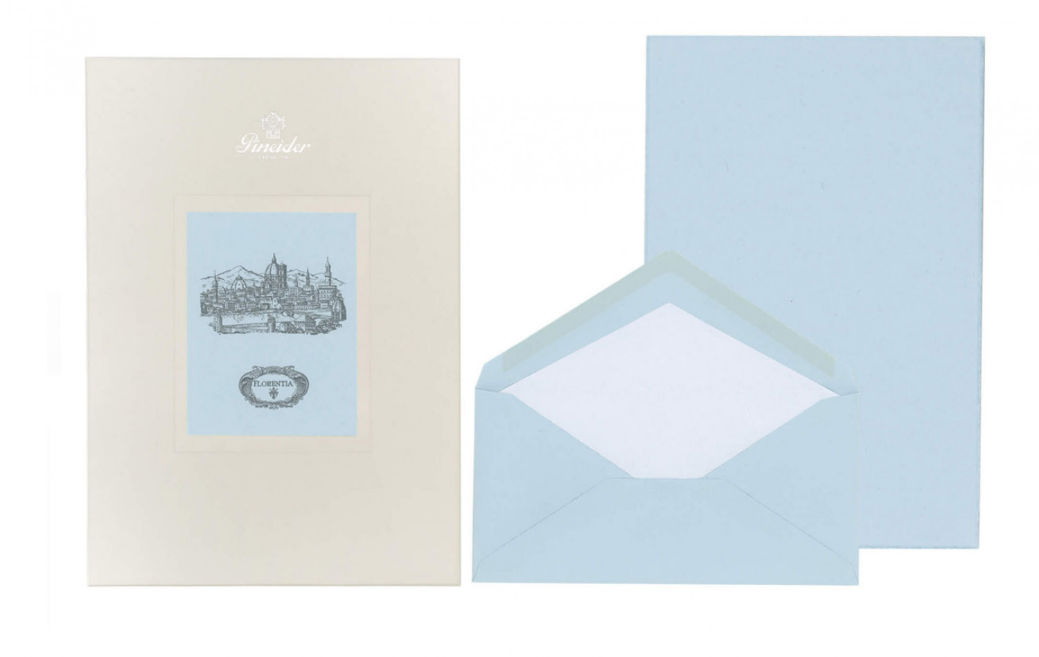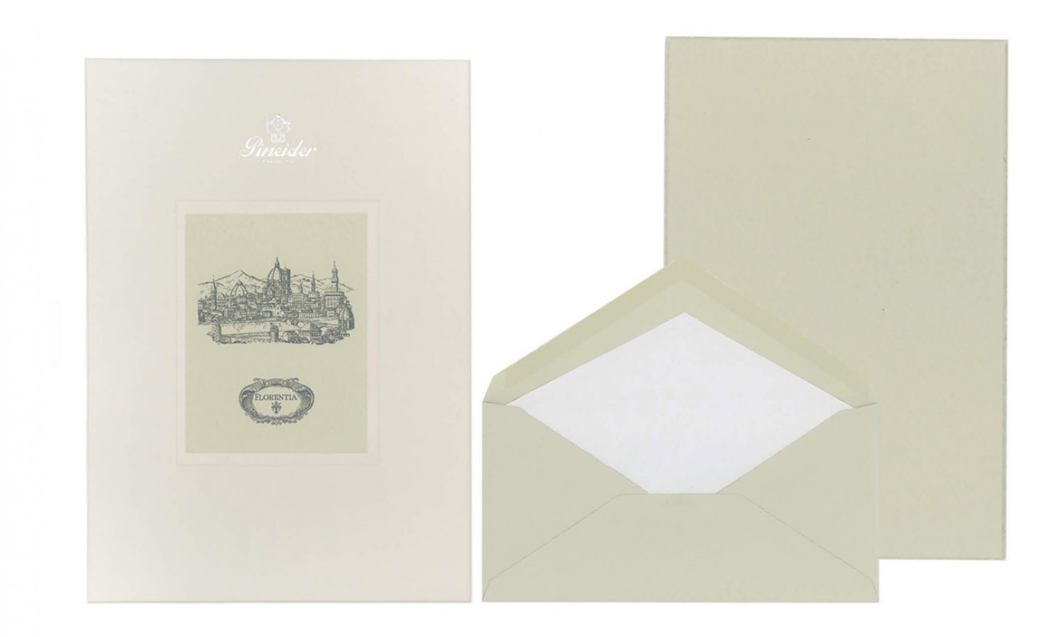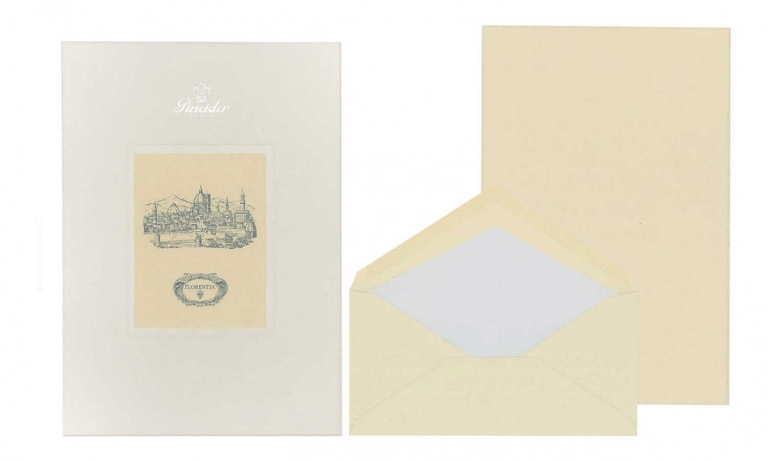 Set Florentia 24 fogli + 24 buste - Form. A4. Carta liscia, 110 gr. sfrangiata e filigranata Pineider. Cartoncini lisci, sfrangiati. Buste 110 gr. foderate con carta velina biancae personalizzate con logo Pineider a secco.